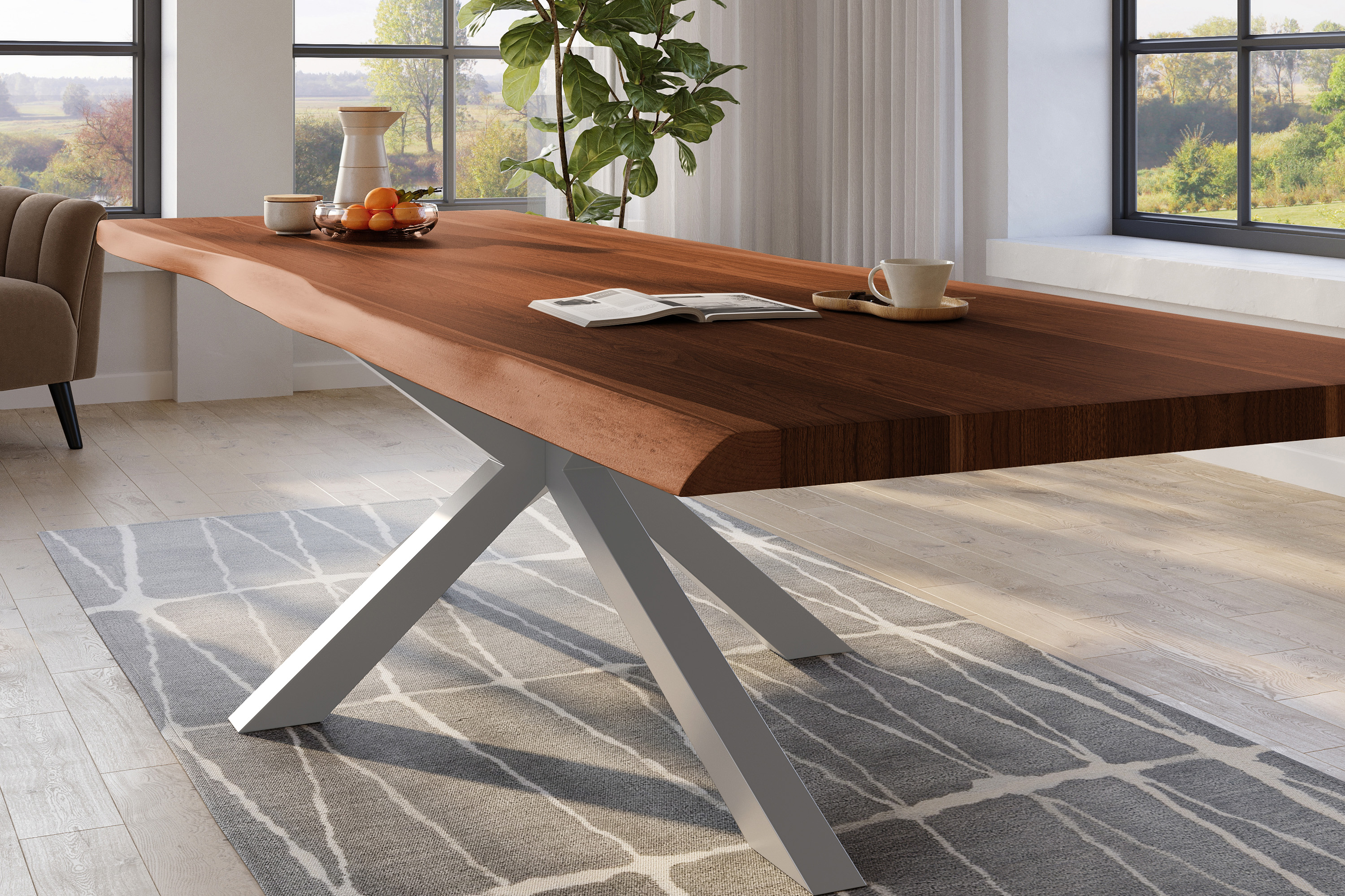 Industrial-Look: Das silberne Spider-Gestell aus Metall bildet einen stilvollen Kontrast zum warmen Massivholz und sorgt für Stabilität sowie wackelfreien Stand.