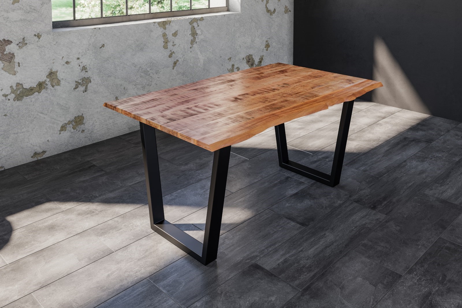 Esstisch Baumkante Massiv Mango naturfarben 140 x 80 schwarz V-Gestell DORA