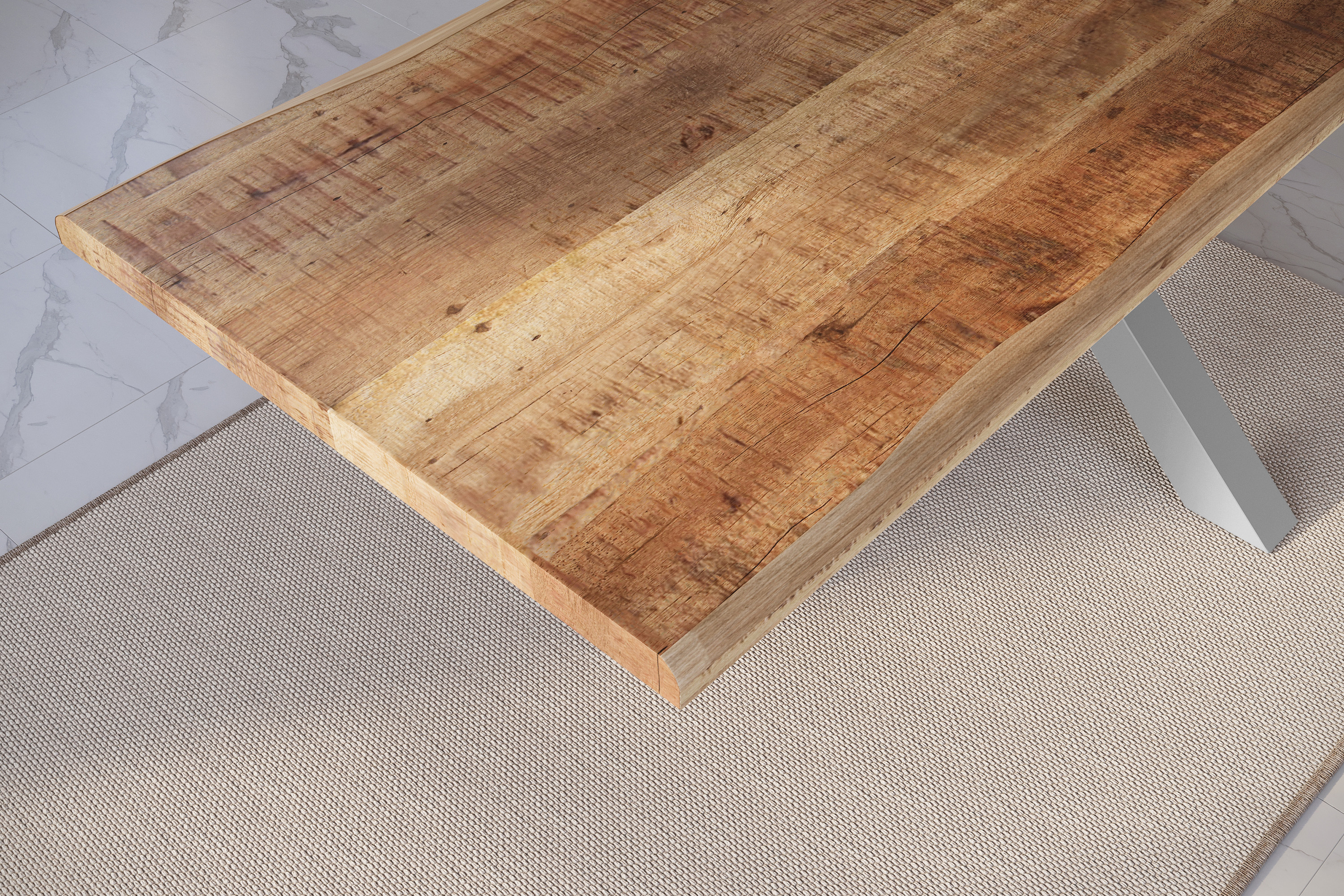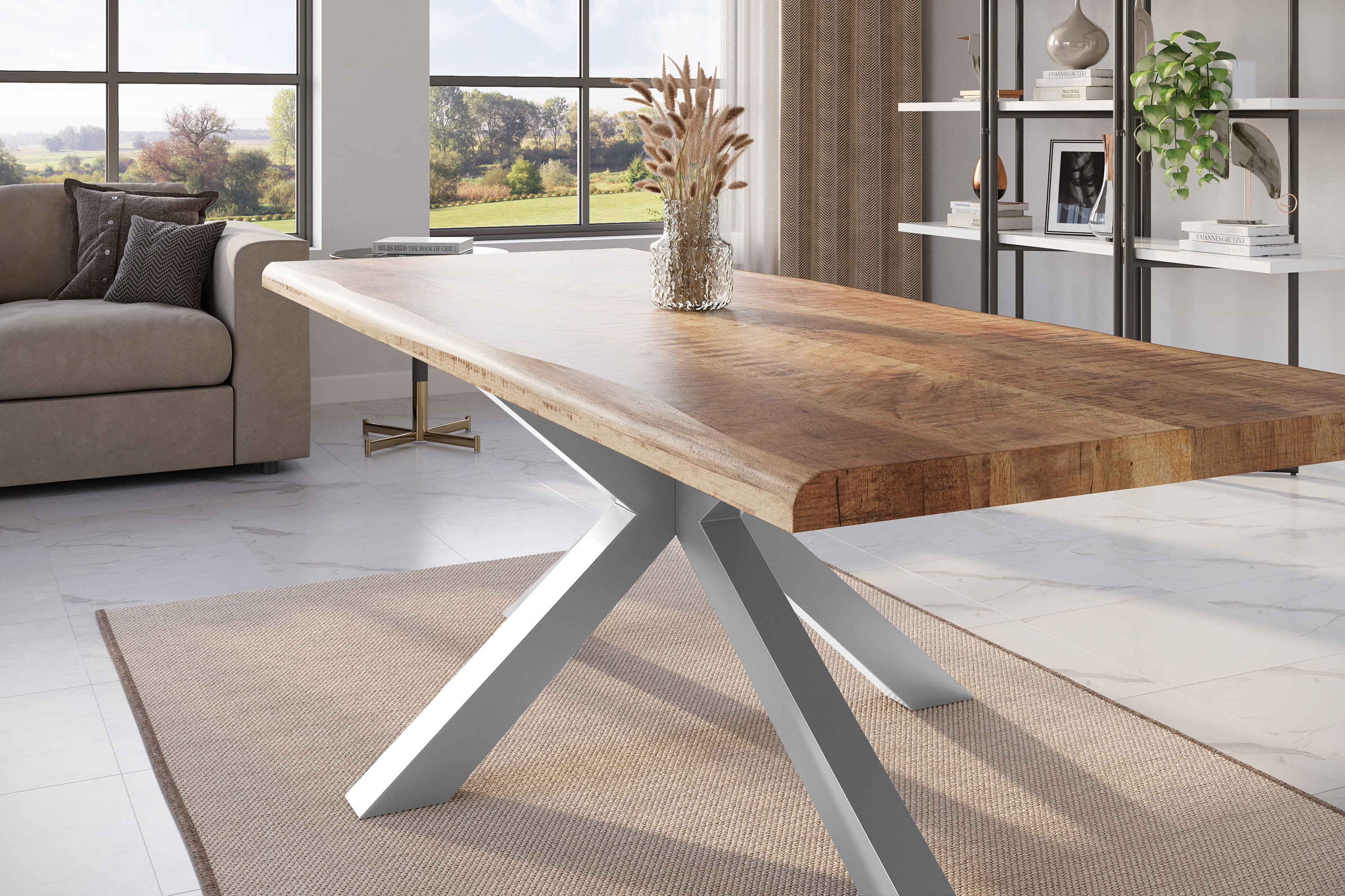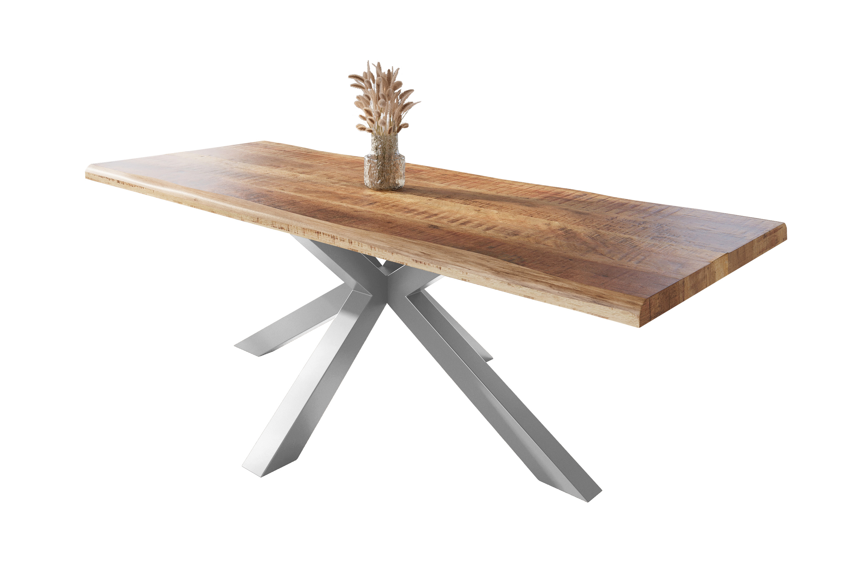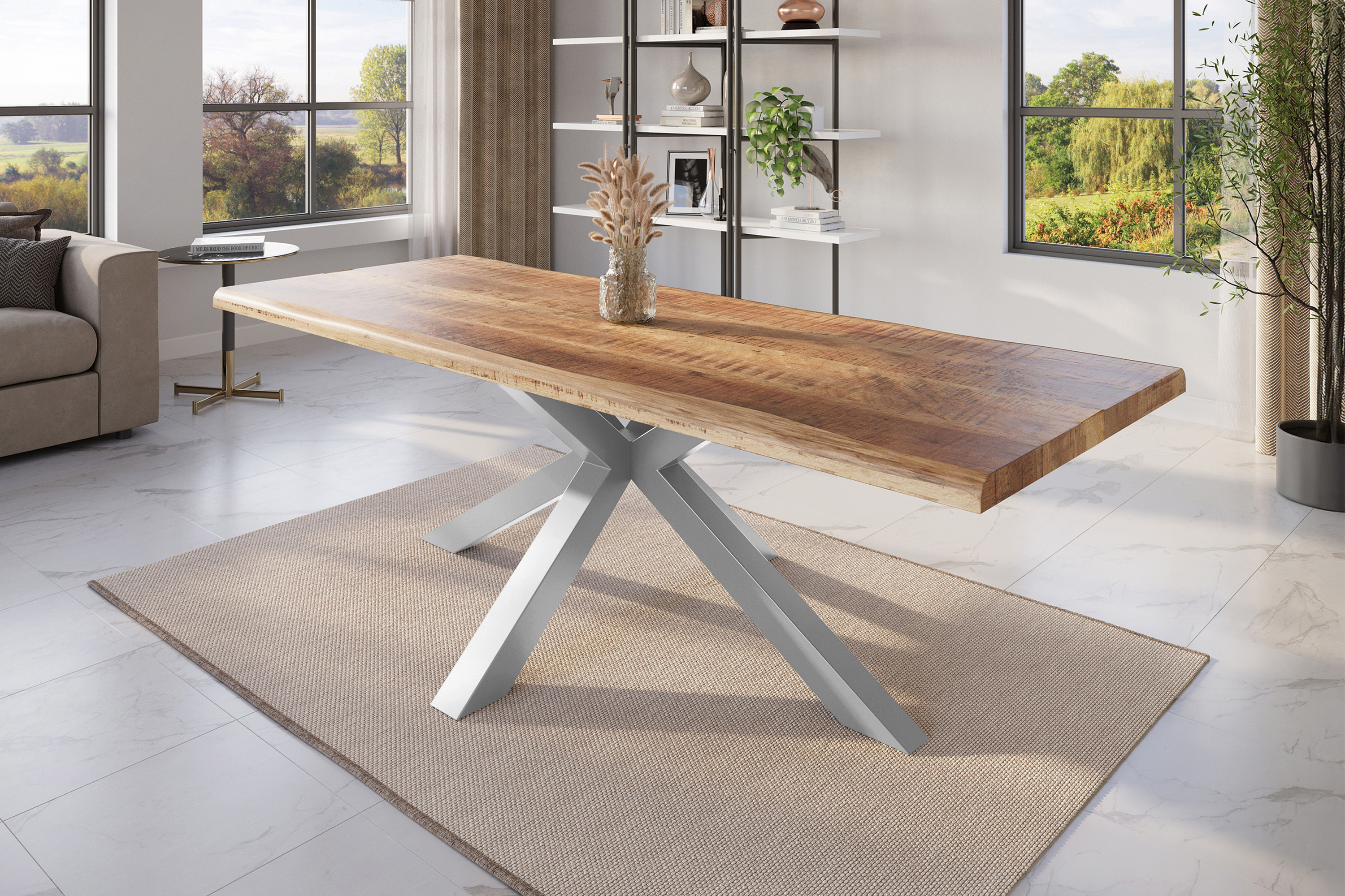 Esszimmertisch Atlas, 280 x 100 cm, massives Mangoholz naturfarben / rough, echte Baumkante, Spider-Gestell aus Metall Silber