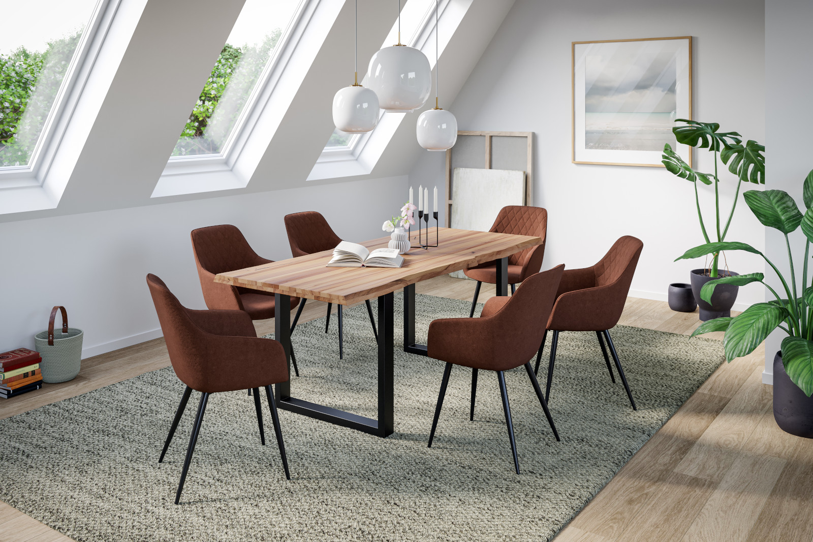 Der trendige Esstisch überzeugt durch eine perfekt gelungene Kombination aus Natürlichkeit und stylischer Moderne. Holen Sie sich dieses Unikat mit individuellem Charakter für Ihr Esszimmer.