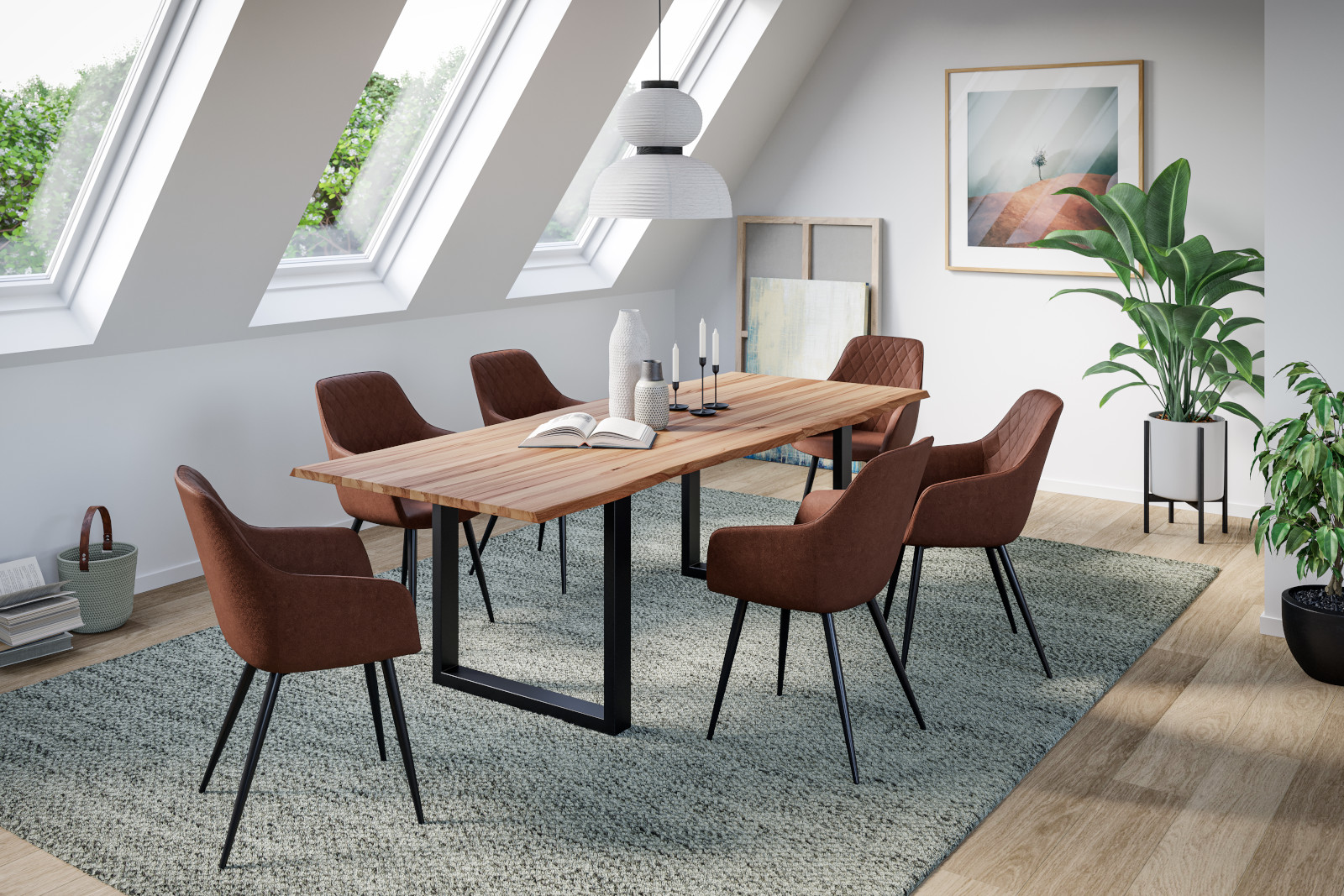 Der trendige Esstisch überzeugt durch eine perfekt gelungene Kombination aus Natürlichkeit und stylischer Moderne. Holen Sie sich dieses Unikat mit individuellem Charakter für Ihr Esszimmer.