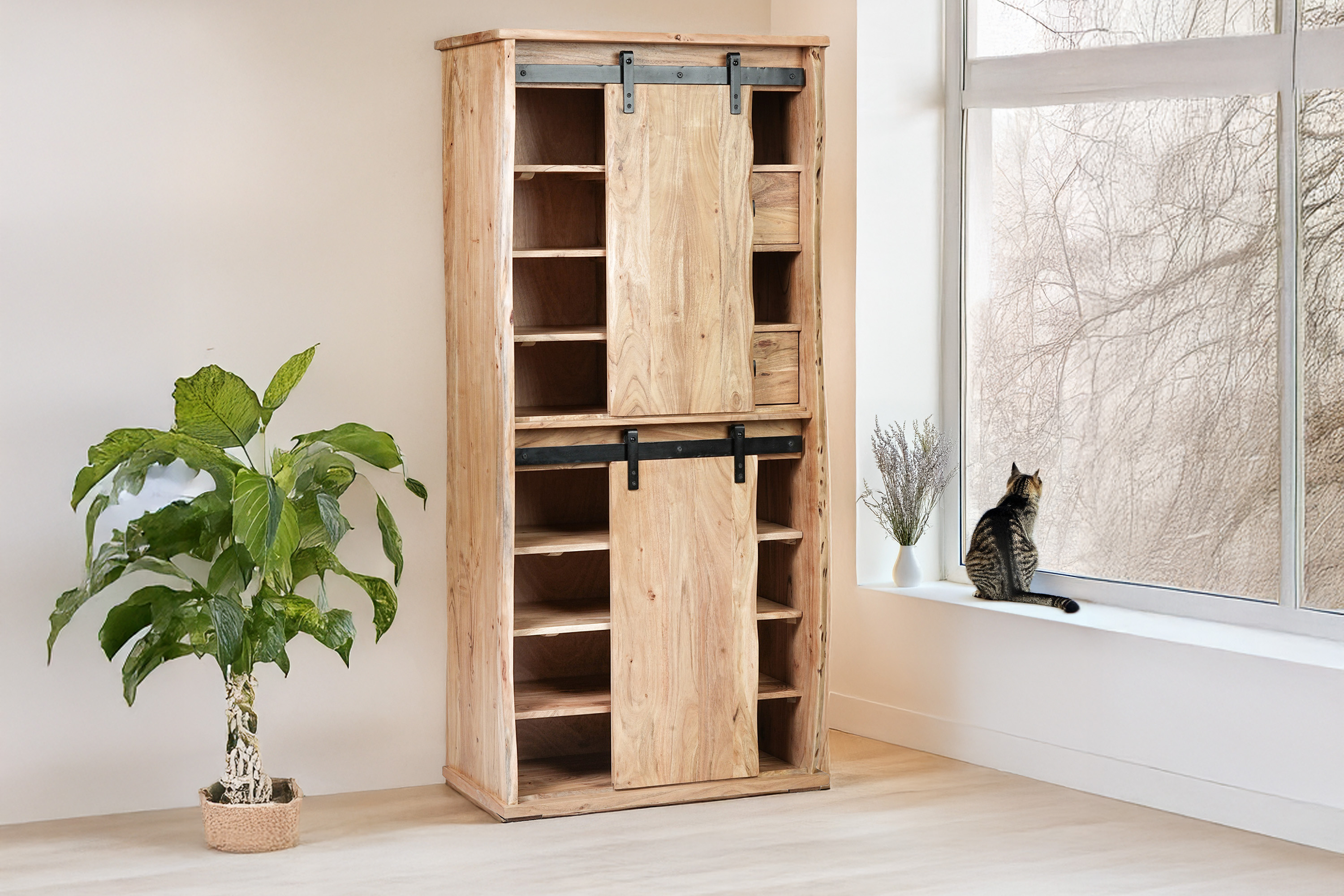 Schiebetüren mit Baumkante: Die echten Baumkanten der Holztüren unterstreichen den rustikalen Charakter und machen jedes Möbelstück einzigartig. Die natürlichen Formen sorgen für eine harmonische Optik und ein besonderes Design.
