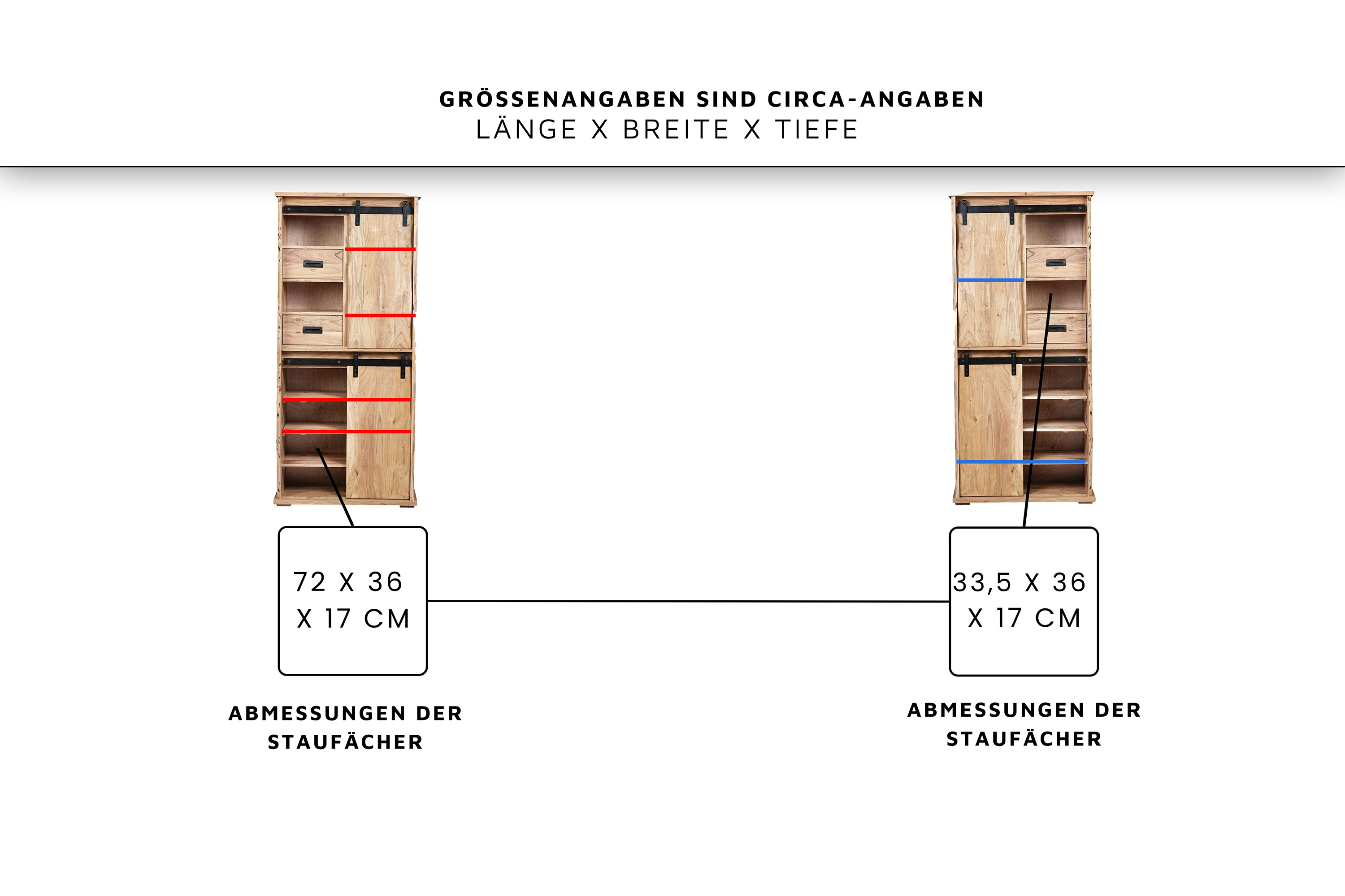 Viel Stauraum: Mit 10 geräumigen Fächern bietet das Highboard vielseitige Ablagemöglichkeiten und Stauräume für Deko und vieles mehr. Ergänzt wird der Stauraum durch 2 praktische Schubfächer, ideal für kleinere Gegenstände.
