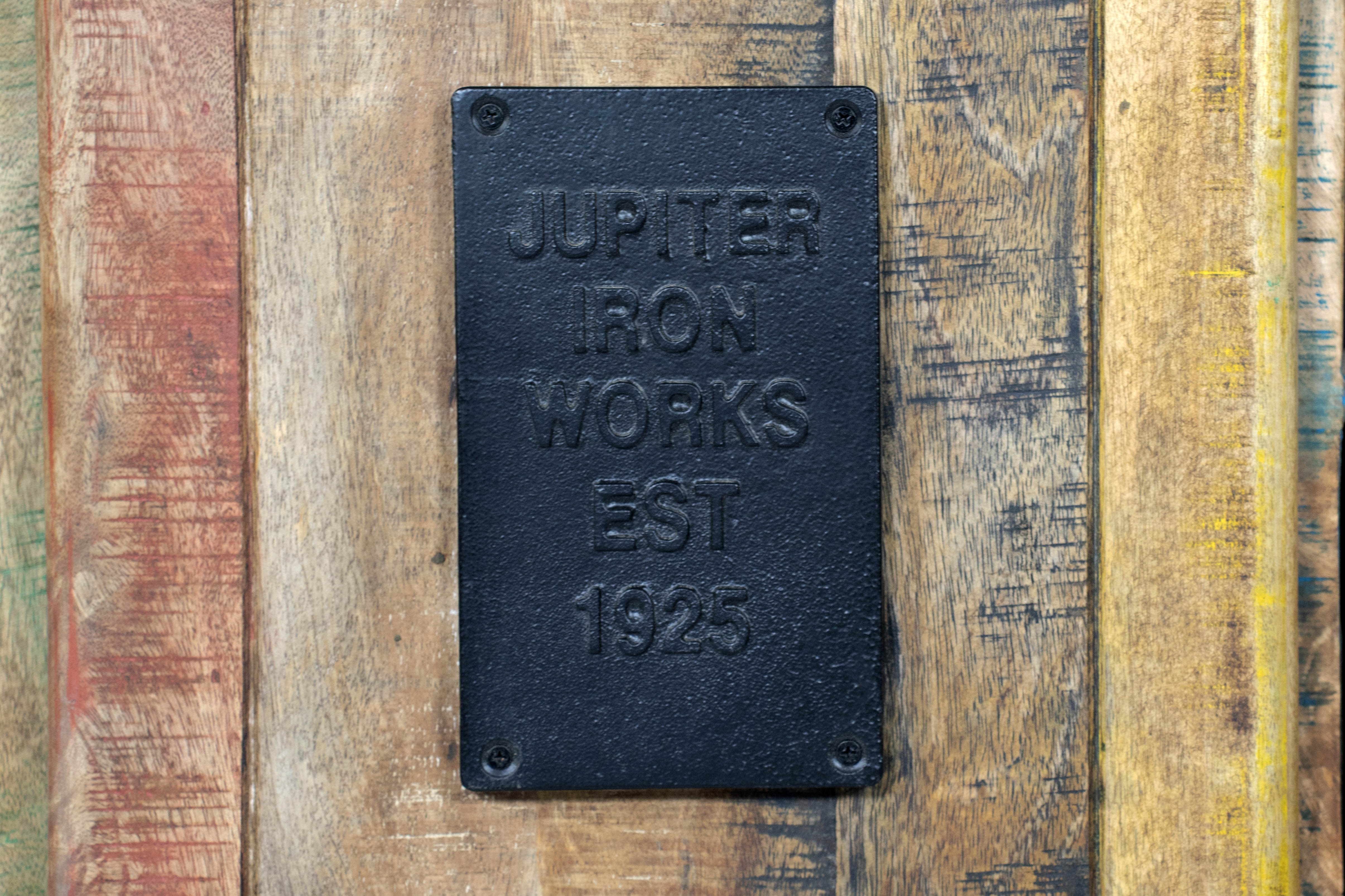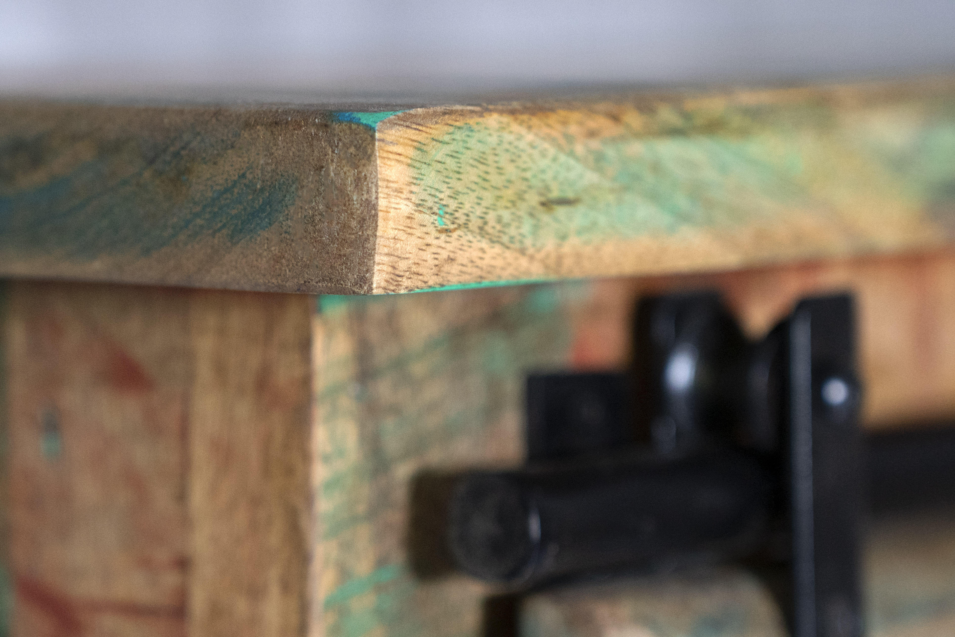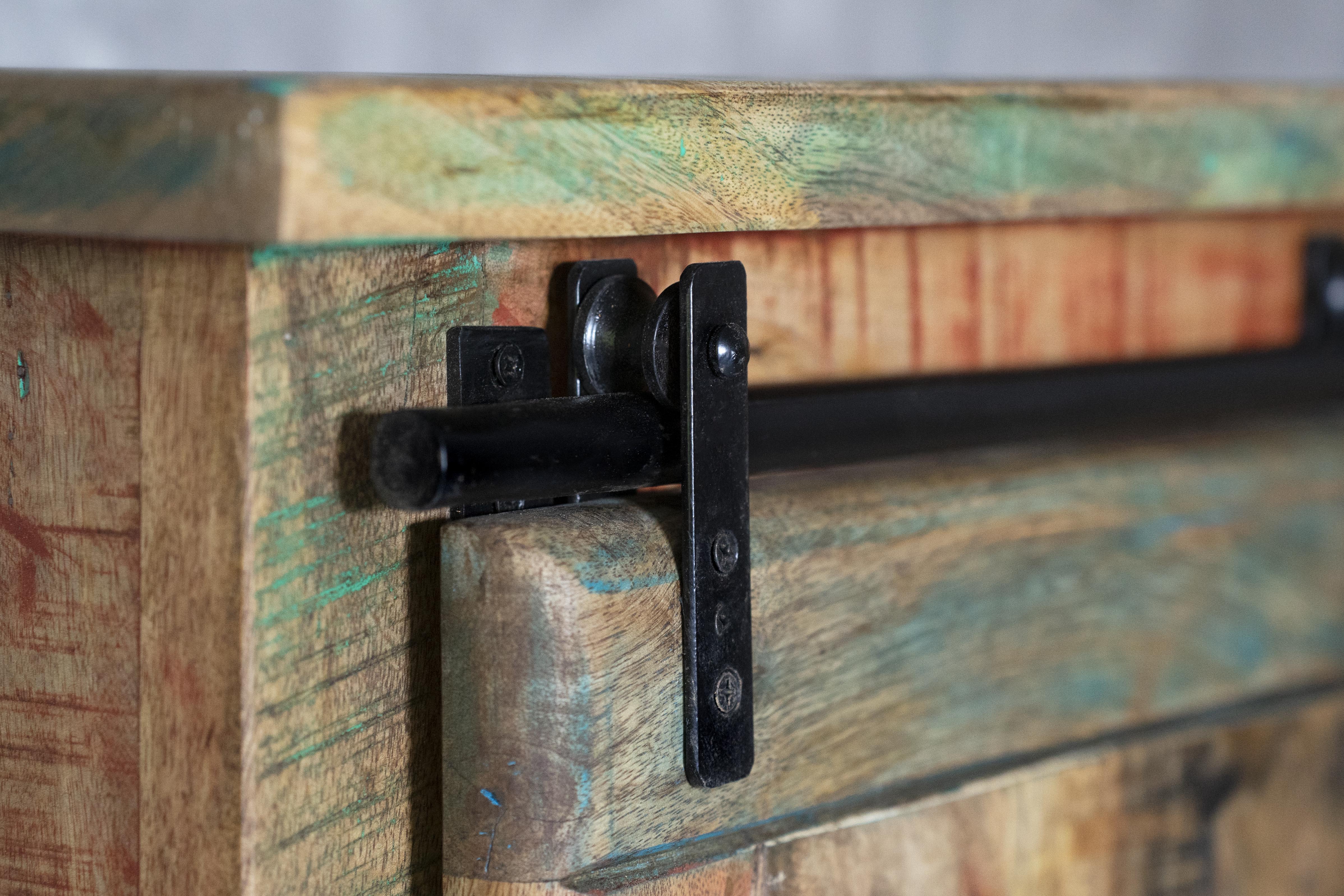 Stilgerechte Metallelemente – Der Hochschrank zeigt sich mit verschiedenen Metallelemente. Mit der angebrachten Eisen-Reling und den Metallrollen kann die Schiebetür von rechts nach links geschoben werden. An der Tür befindet sich eine stilvolle Applikation aus Gusseisen. Alle Schubfächer verfügen über stilgerechte Griffe aus Eisen. Der Schrank harmoniert bestens mit anderen Wohnmöbeln aus den Stilrichtungen Industrial, Modern oder Rustikal.