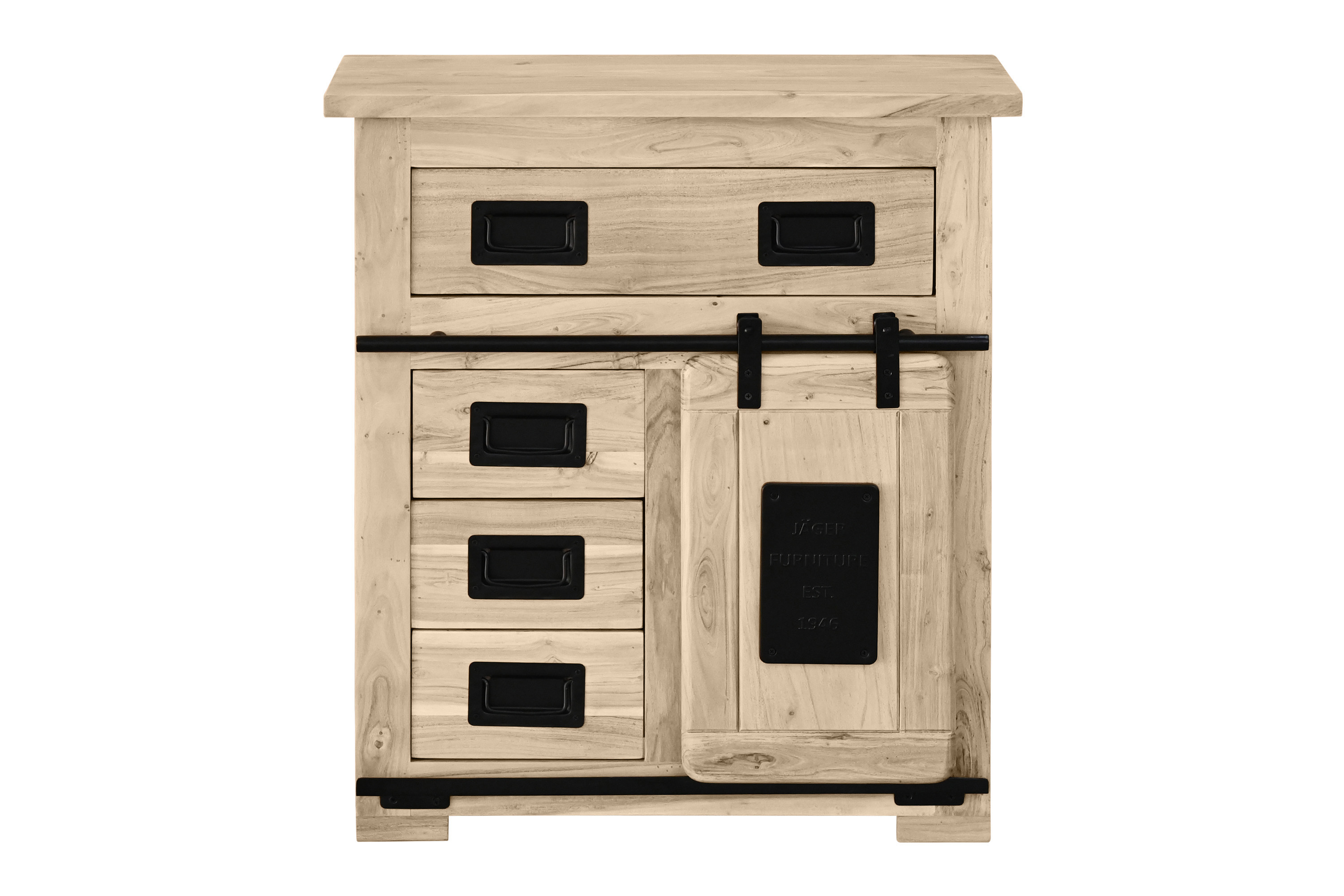 Trendiges Sideboard Libro, Akazienholz massiv & eichefarben, 1 Holzschiebetür, 4 Schubladen & 2 offene Fächer, Maße ca. 75 x 35 x 85 cm